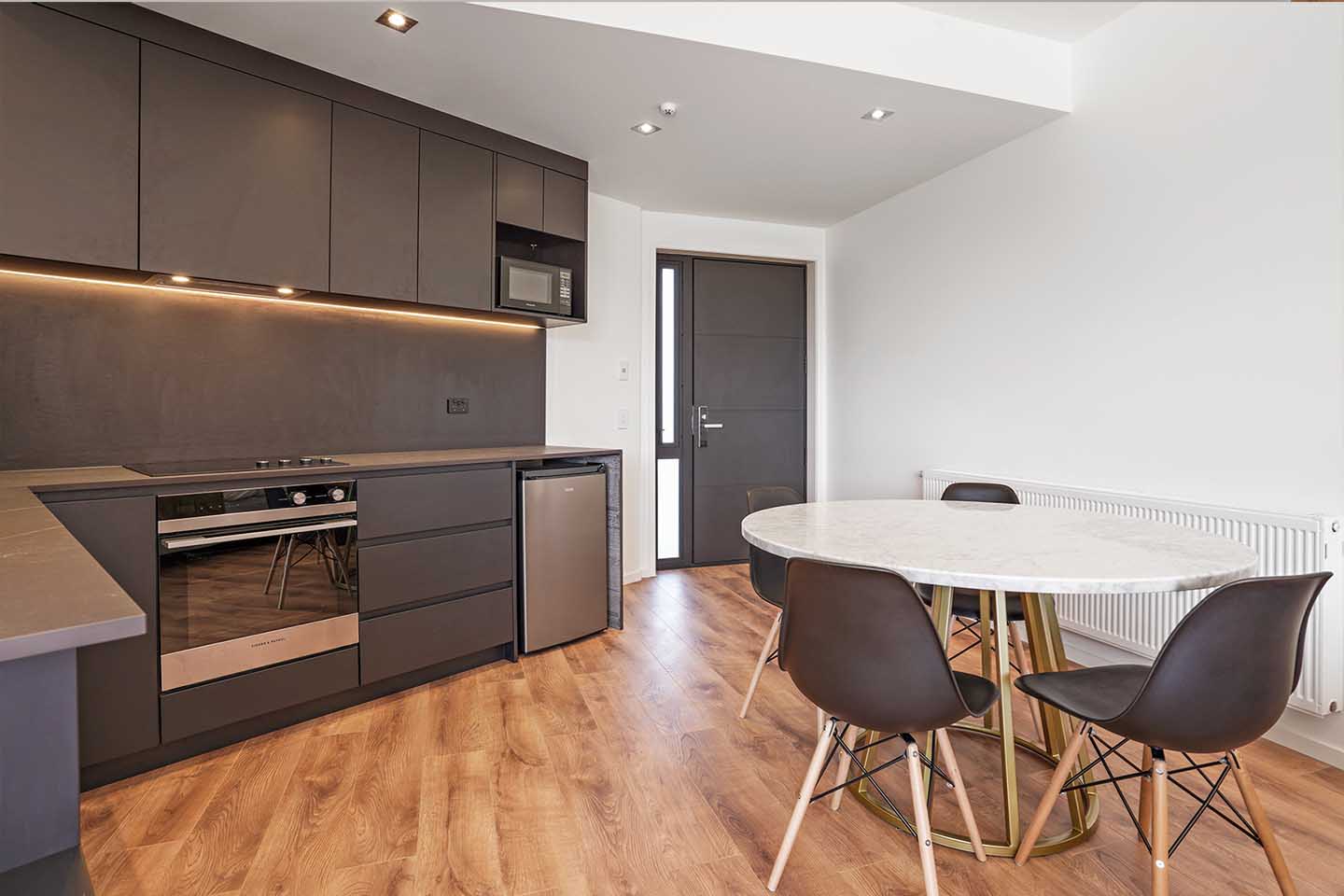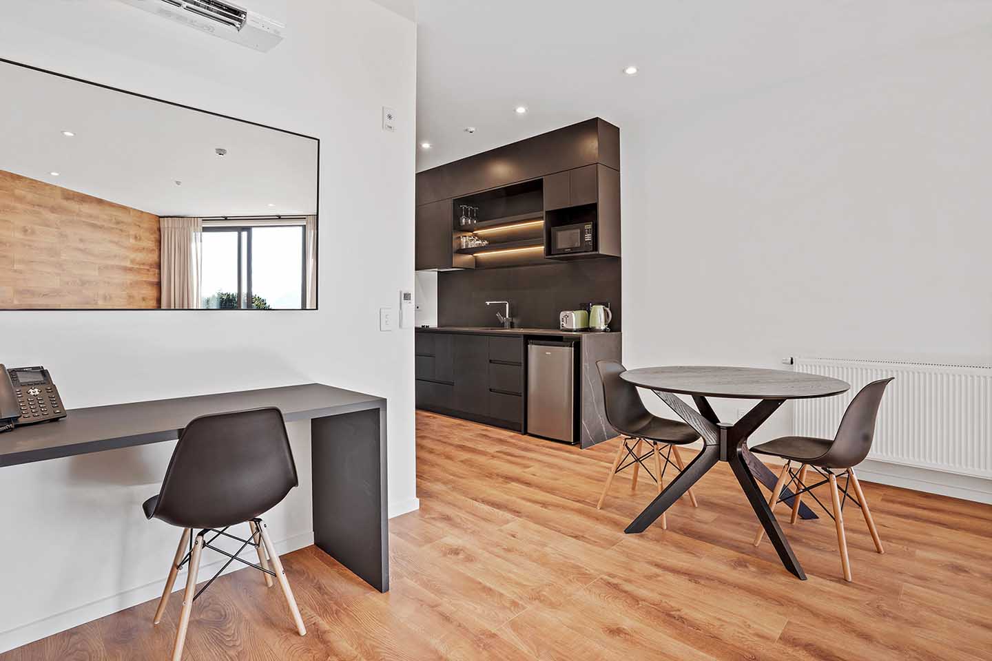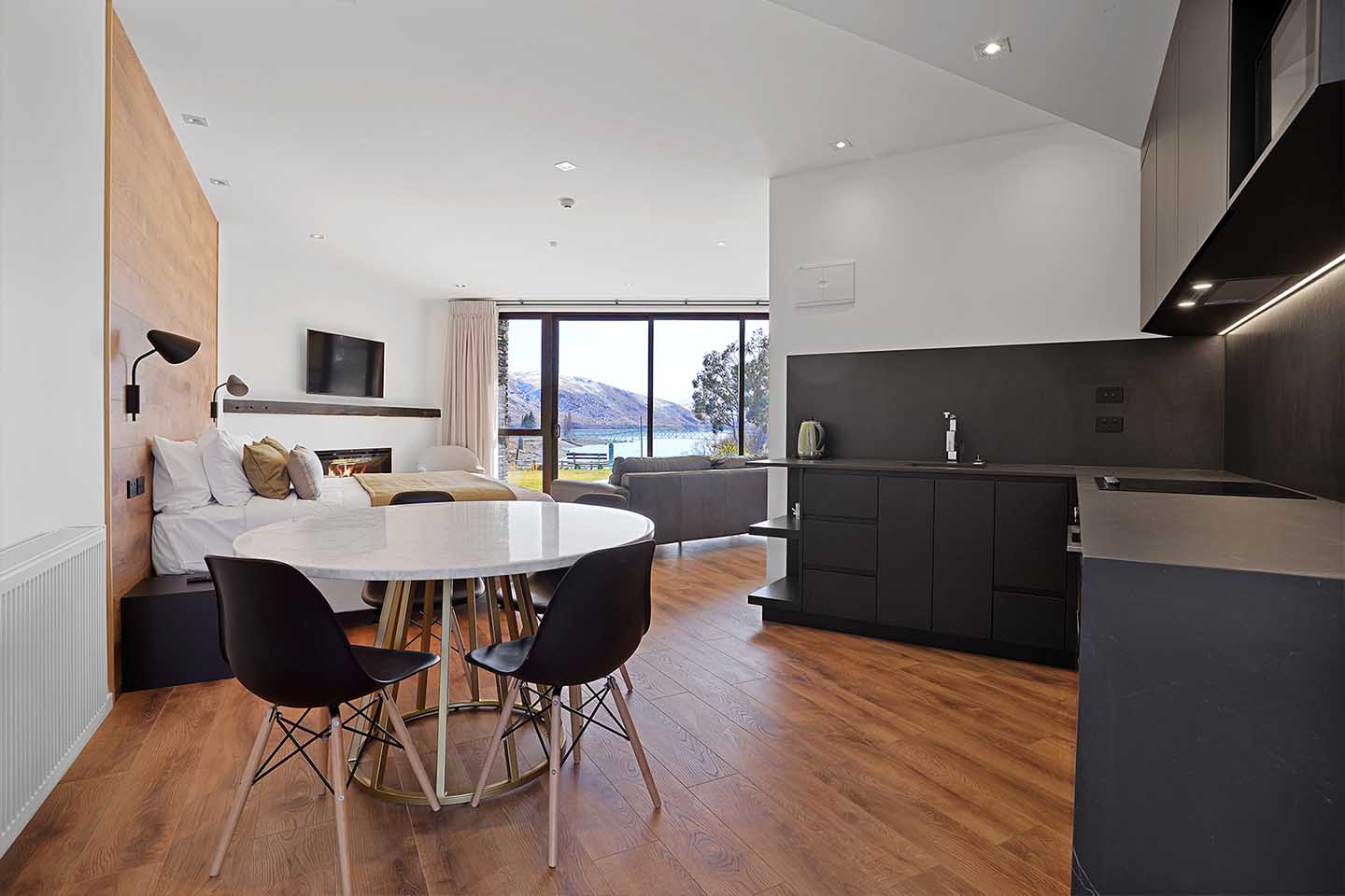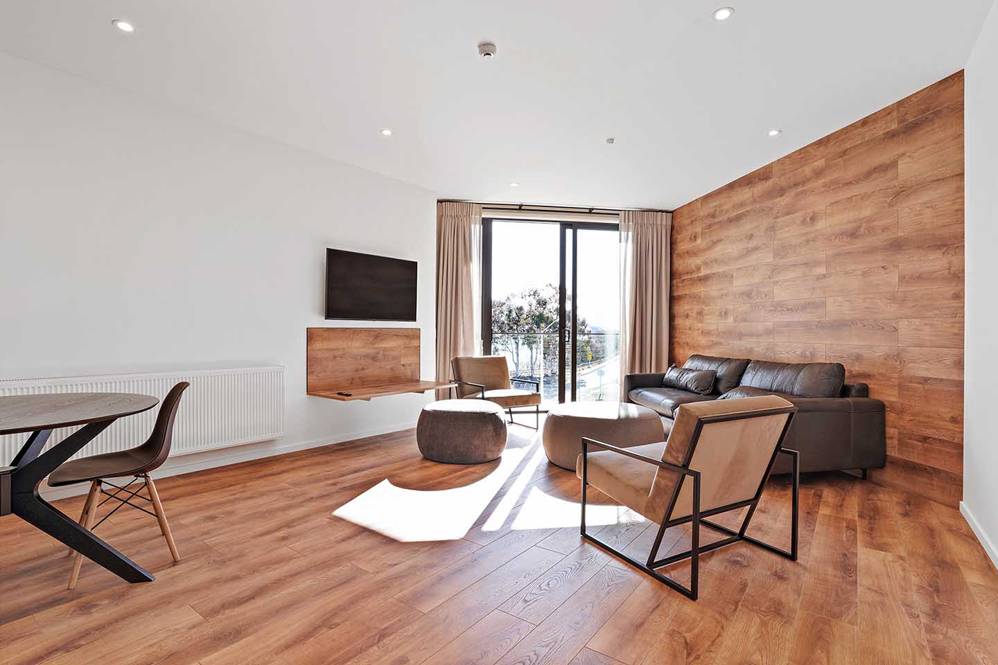The Grand Suites Lake Tekapo hotel features Woodland Lifestyle's Euro Deluxe laminate flooring in the colour Sunset Oak. The colour was chosen for its natural, inviting tone, adding warmth and complementing the surrounding landscape.